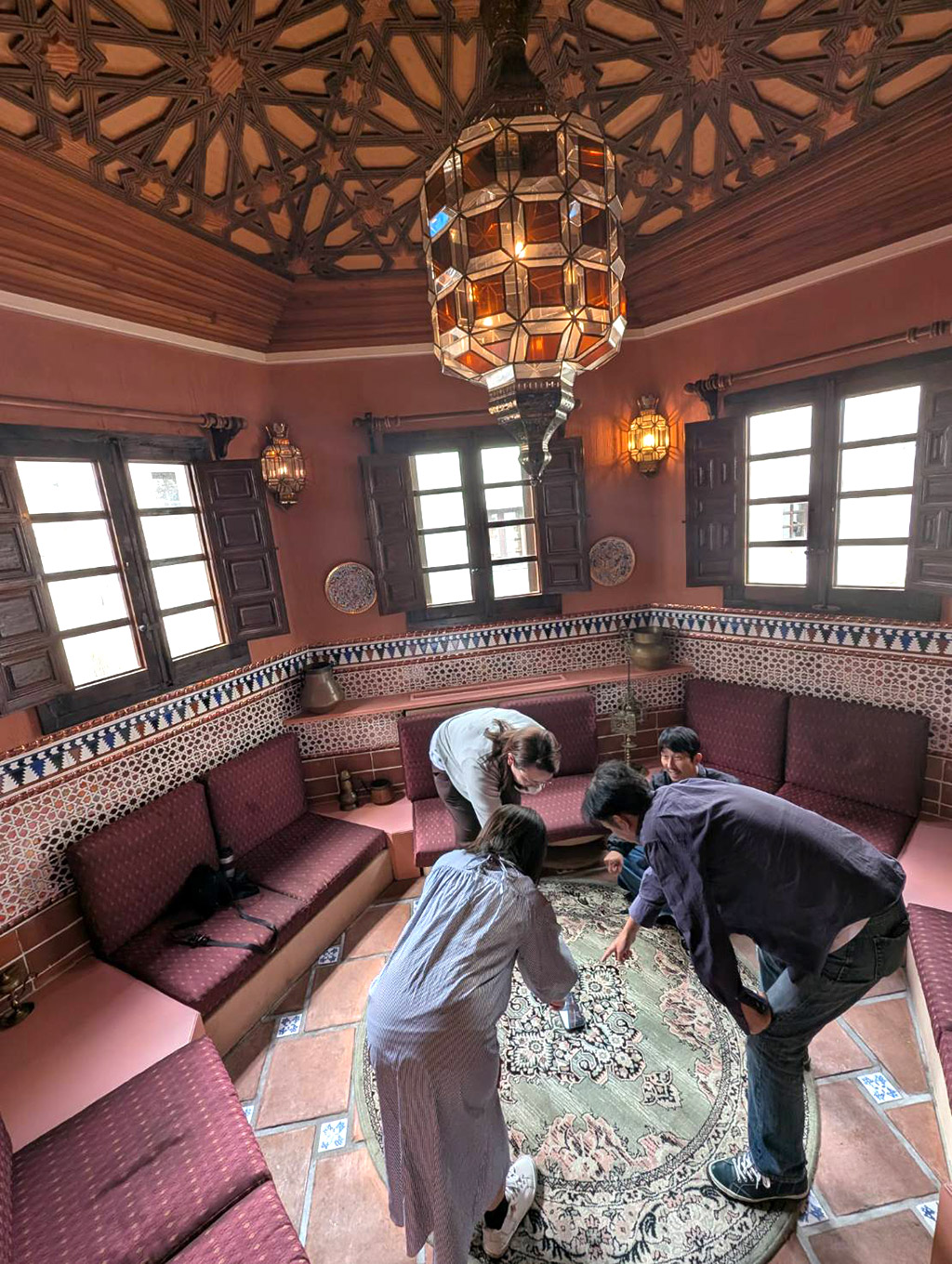 装飾が美しいアーチ天井のあるスポットでは、スマートフォンを床に置き、インカメラで上から覗き込むというユニークな構図を提案。普段とは異なる発想に、参加者からは驚きと笑顔がこぼれました。ほかにも、空とのバランスを意識した広角での俯瞰撮影、格子越しにピントを合わせるテクニック、模様の美しい床を活かしたアングルなど、日常では気づきにくい視点を取り入れた撮影方法が紹介され、参加者たちは自ら撮った写真を見ながら「こんな写真が撮れるなんて」と歓声があがりました。